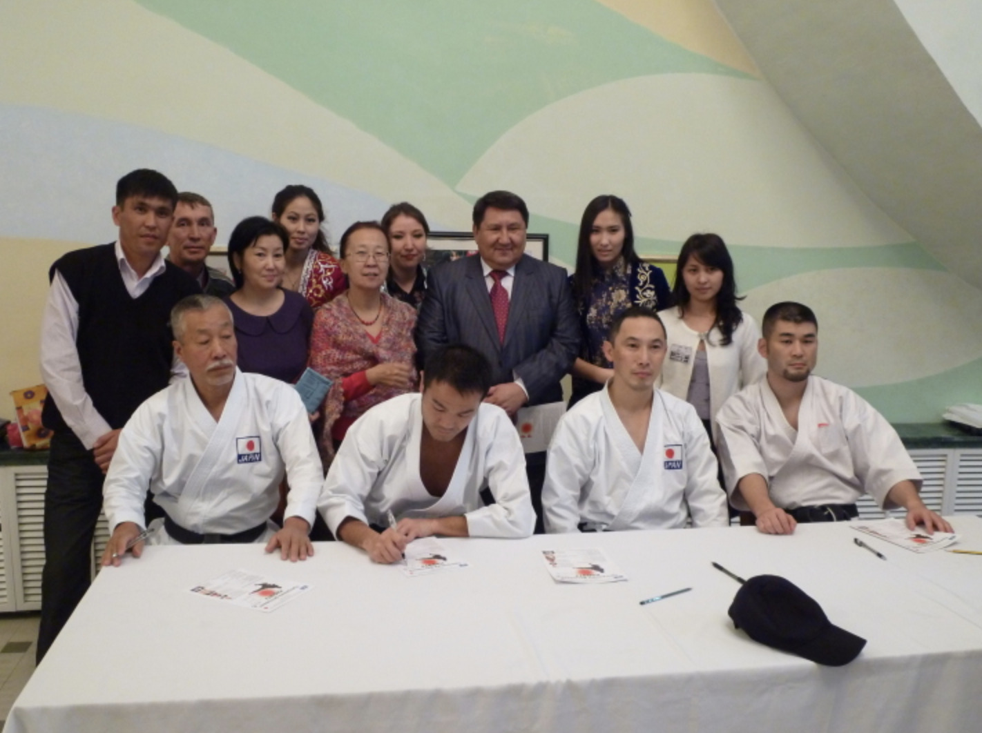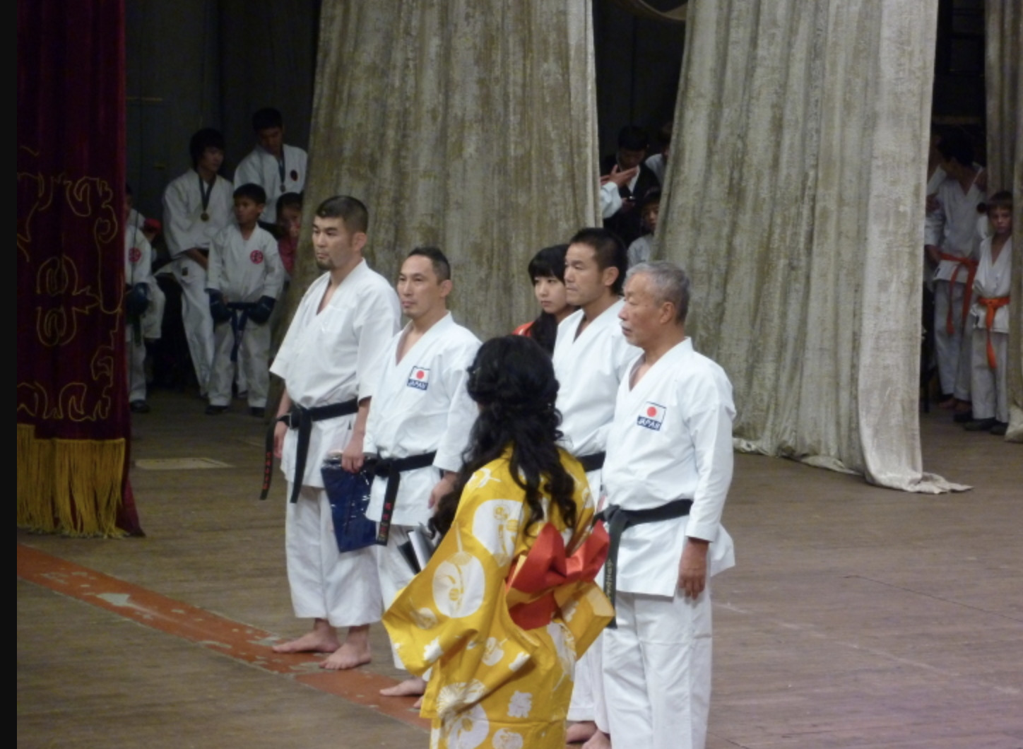 | 14:00 | デモンストレーション 観客500名の中カザフスタン連盟へ記念品贈呈、カザフスタンより記念品拝受 その後両連盟交互に演武を行い信川は形ニーセーシを演武した。 | |